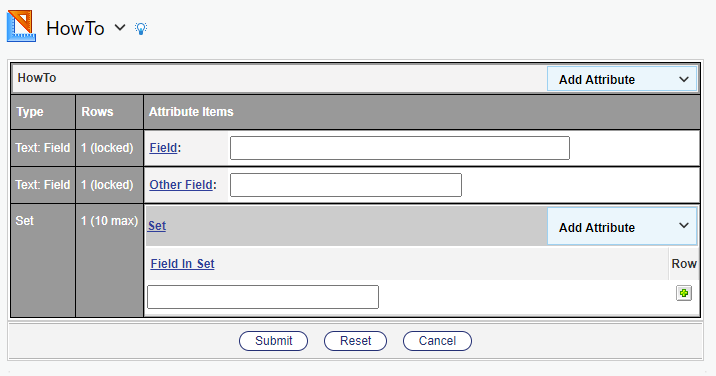 The examples presented in this paragraph are all making use of a Form Object named HowTo Form associated to a FormTemplate object named HowTo having the following structure.