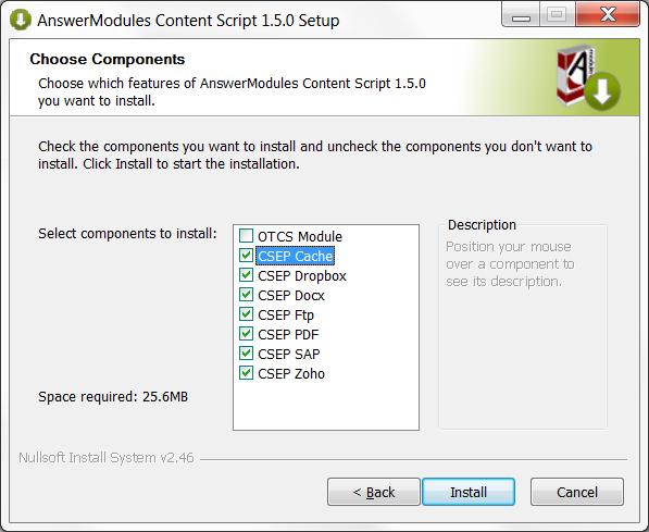 - Components selection:Unselect the OTCS Module component. Select all of the extension components that are to be installed