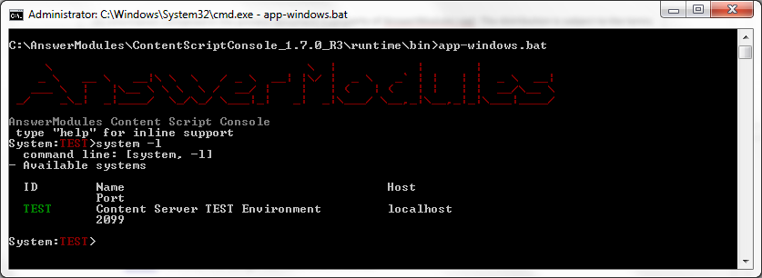 To perform configuration against an OTCS instance, run the Script Console in shell mode. To do so, open a Windows Commands Processor and move to the folder: %AM_CONSOLE_DATA%/runtime/bin which includes the Script Console's executables scripts