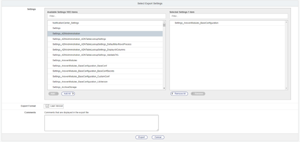 - In this page, add the Setting_AnswerModules_BaseConfiguration to the Selected Settings list, flag Lean Versions (as showed in the screenshot below) and click on Export to export the XML file containing the Module Suite configuration.