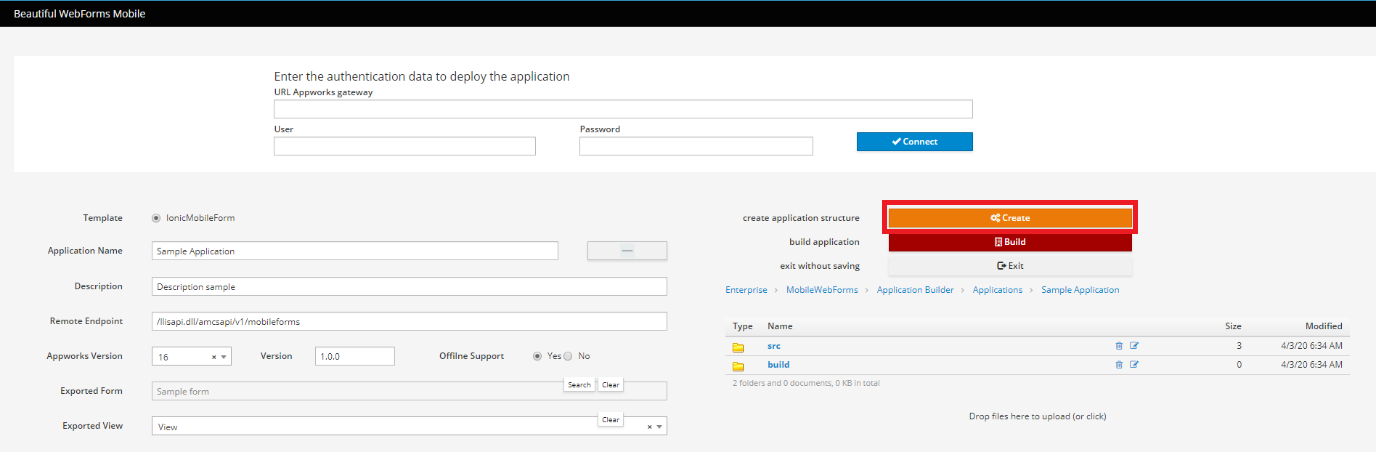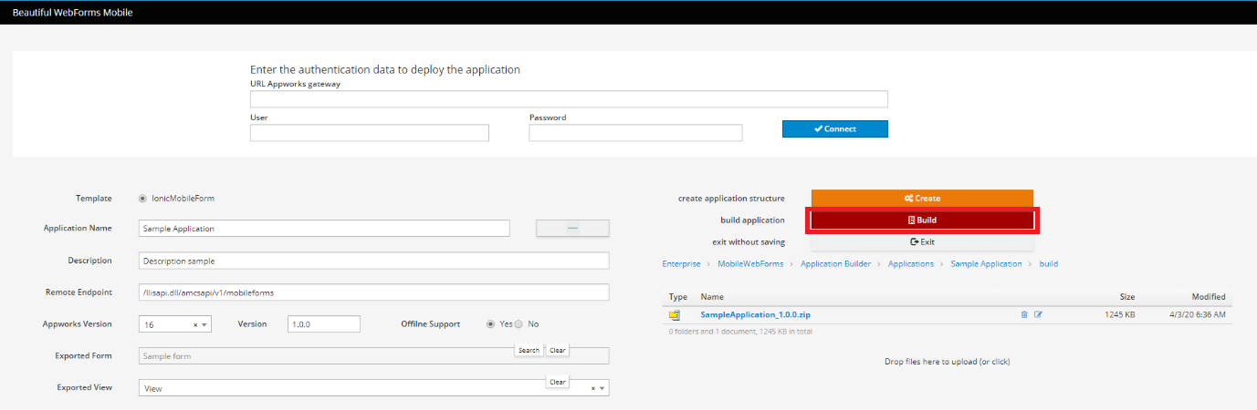 Once the application's structure has been created it will be possible to create an OpenText AppWorks Gateway deployable package by clicking on the "Build" button.