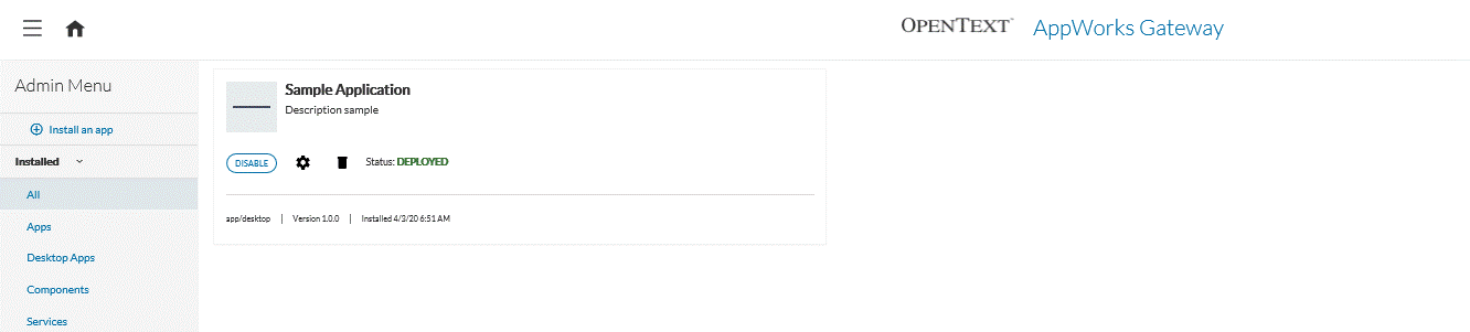 To verify the correctness of the process access the OpenText AppWorks Gateway and verify that in the "Installed" section the application to be distributed is present and enabled.