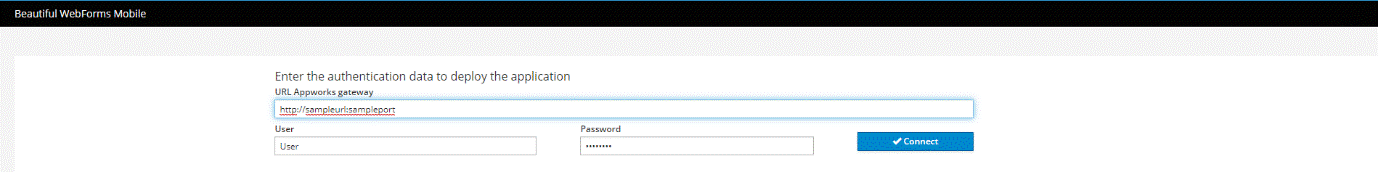 To upload the application to the OpenText AppWorks Gateway, enter the path and the authentication credentials of the destination OpenText AppWorks Gateway and click "connect".