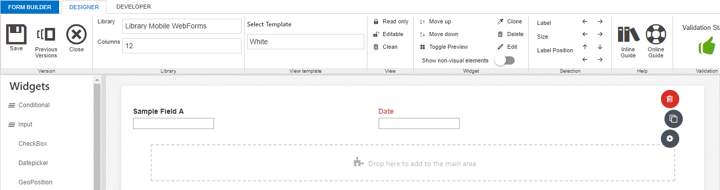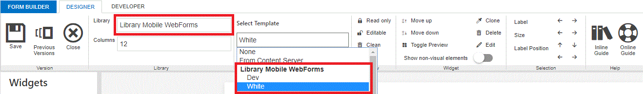 When editing a form's view with the Form Builder, the form's view will be pre-populated with the widgets representing the elements inserted in the Form Template. A Mobile WebForms will need to be designed using specific widgets coming from the Mobile WebForms Library, to do so delete the self created widgets derived from the form template, verify that the Library Mobile WebForms is selected, save the form's view and refresh the page. Once the page has refreshed drag&drop the widgets from the left-hand side of the Form Builder to the form's view.