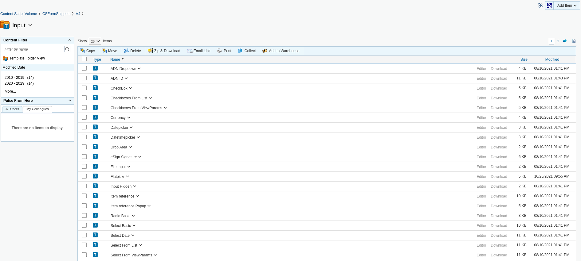 The CSFormSnippets container is organized on two levels: the first level is a container and identifies the Component Family, while at the second level there are the actual components.