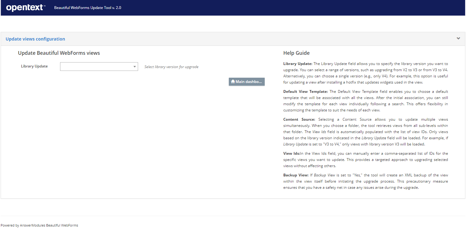 To Proceed with the update your web forms click on the Update button from the Main dashboard, you will be redirect to the Views Update Page.