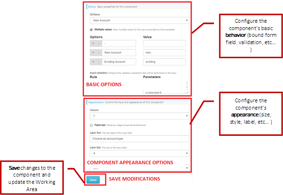 When a widget in the Main Working Area is selected, the Configuration Panel can be activated through the dedicated menu option or by right-clicking the widget. The content of the panel is specific to the type of widget, and allows to define the widget binding to underlying form fields (in case of input widgets), as well as how the widget will be rendered, what validation rules will be applied to it, and any other setting that could be necessary for the specific widget.