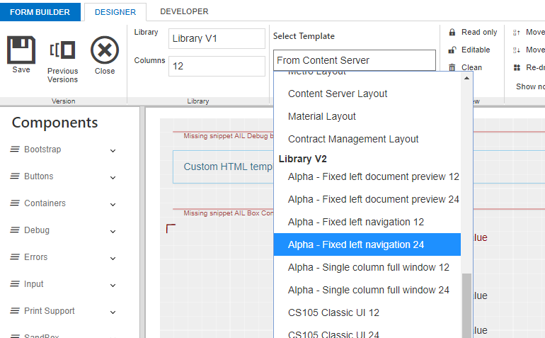 The Widgets library is an extensible set of form widgets that can be used through the drag & drop visual editor. To simplify the navigation, the widgets are arranged in families of objects with similar functionalities.