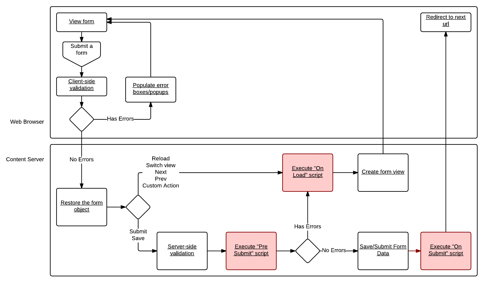 Beautiful WebForms are managed through a dedicated endpoint. Upon submission, the underlying engine performs server side validation. Only after successful validation, the form data is eventually submitted to Content Server.