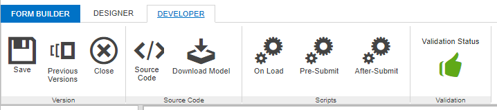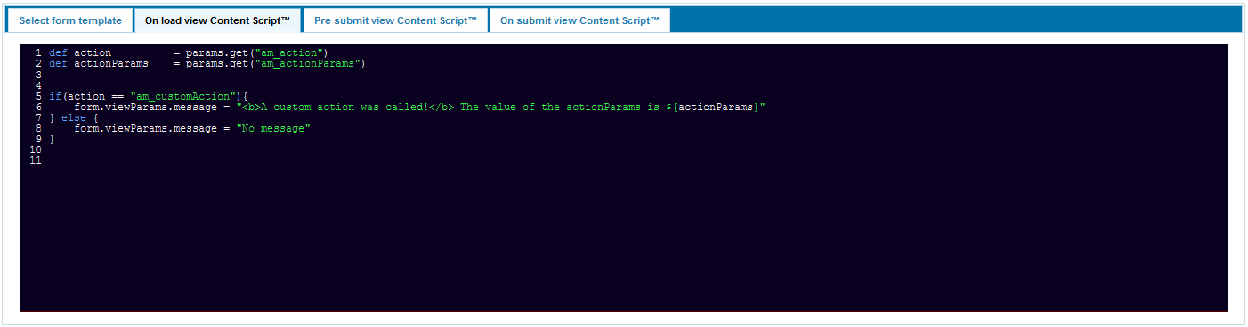 Throughout the whole process and in all of these scripts, a form object is available in the execution context. This object allows to fetch and manipulate the form data, as well as programmatically add or remove validation errors.