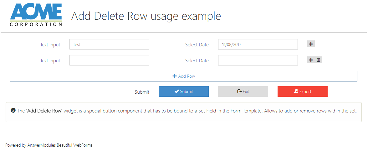 The 'Set field' widget serves as a special container component designed to bind to a Set Field within the Form Template. It allows iteration over rows within the set, providing a structured way to manage repeated data entries. Visually, it appears as a container where any form components bound to a field within the set should be placed. Configuration options include setting the color, appearance properties, basic properties, an ID/Name, and conditional rendering options to control visibility.