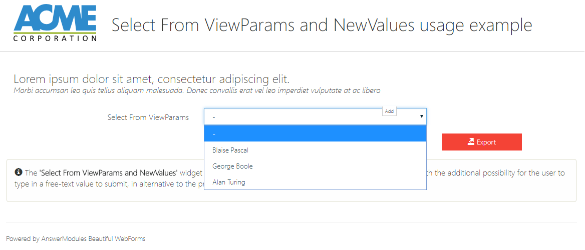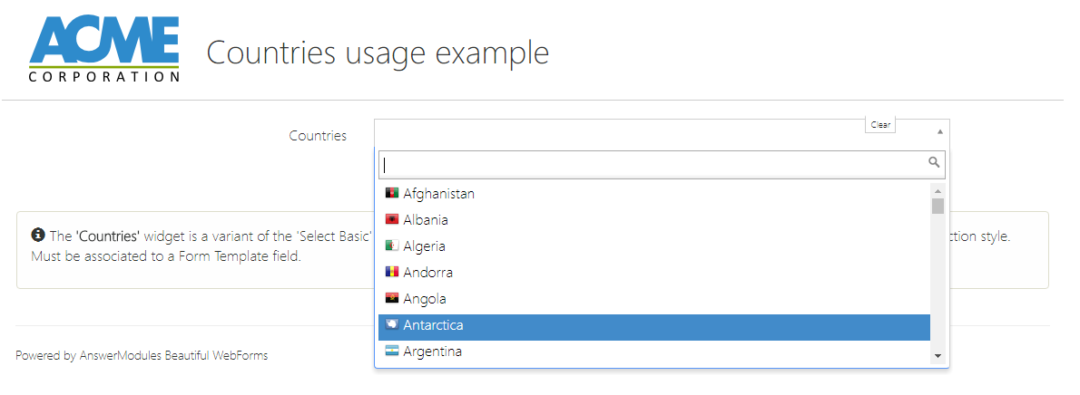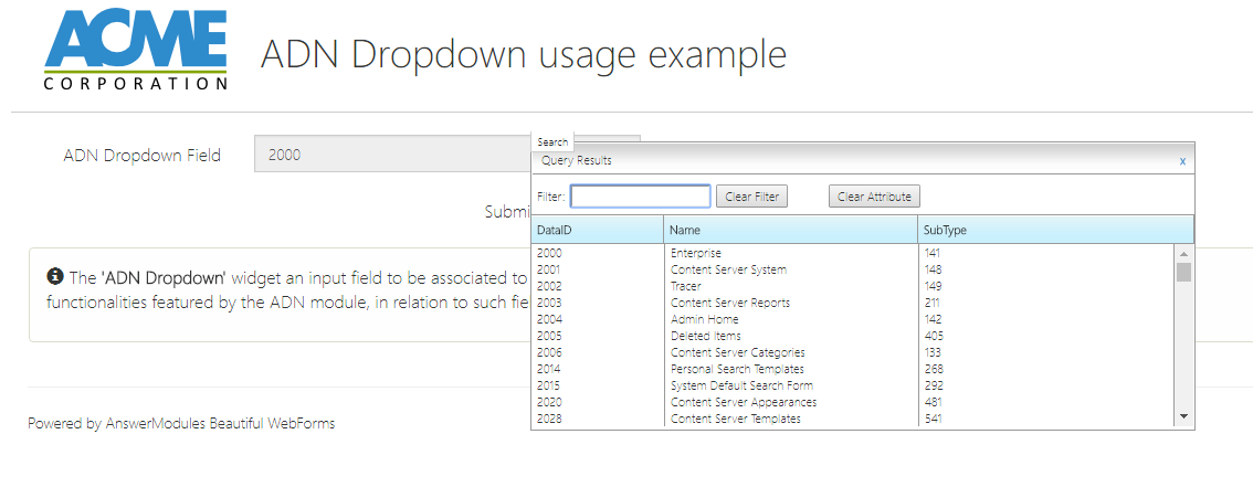 The XENGADN Dropdown widget is designed to connect a form's attribute with the 'ADN table key lookup' functionality within the XENGADN module. It visually represents a dropdown menu, allowing users to select options linked to the ADN module features. Configure options include customizing CSS classes, enabling clear selection, setting default values, and adjusting label positions and sizes. Additional functionalities such as multi-select, popover content, and JavaScript callbacks can also be configured.