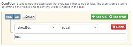 | Condition | input | $am_pbcounter+==+2 | A valid templating expression that evaluates either to true or false. The expression is used to determine if the widget (and its content) will be rendered in the page. |