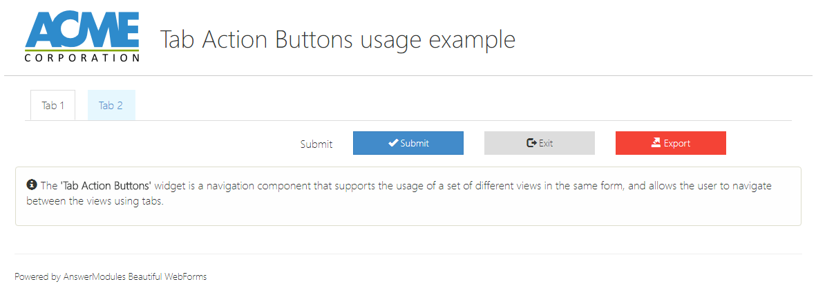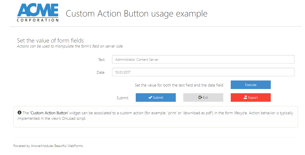 A button that can be associated to a custom action (for example: 'print' or 'download as pdf') in the form lifecycle. Action behavior is typically implemented in the view's OnLoad script.