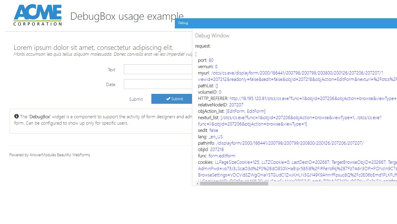 | Action's body (F11 to full screen) | textarea | The server-side business logic to execute for this action. This Content Script will be injected into the OnLoad Script. Access input parameters via 'actionsParameters' or 'params.am_ActionParams', and the action itself via 'params.am_Action'. | |