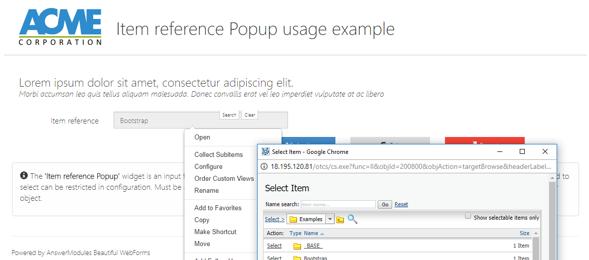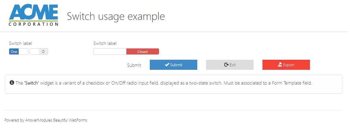 | Action | input | am_redirect_noAjax | Defines the action to be triggered when the widget is interacted with. This action initiates a server round-trip, allowing back-end processing or updates. Specify either a literal action value or a templating expression (e.g., ${form.viewParams.aVariable}) to dynamically determine the action at runtime. |