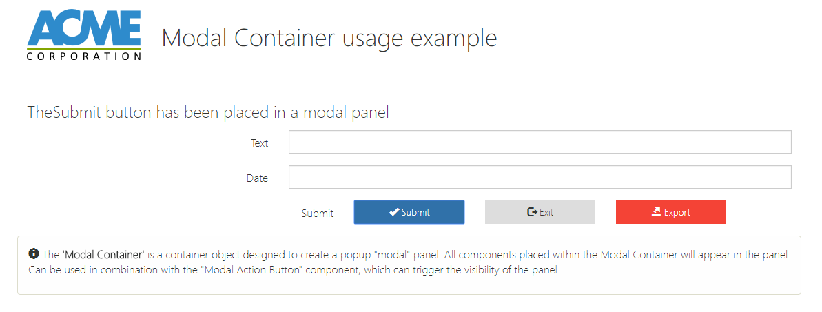 A button that will open an overlay panel. Should be used in combination with a "Modal Container" object, which it controls, and which may contain additional buttons or other components. A typical possible usage is to implement actions that require user confirmation.