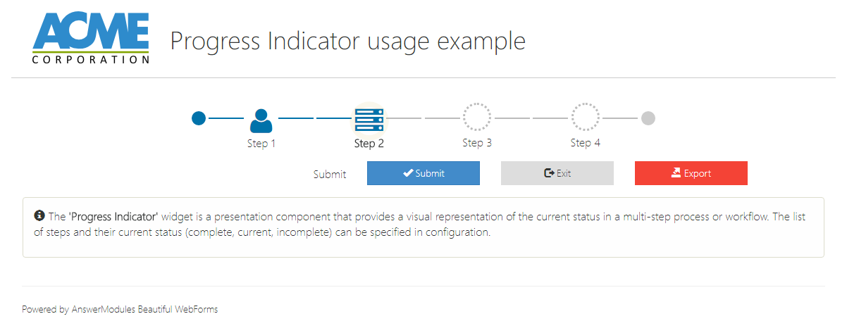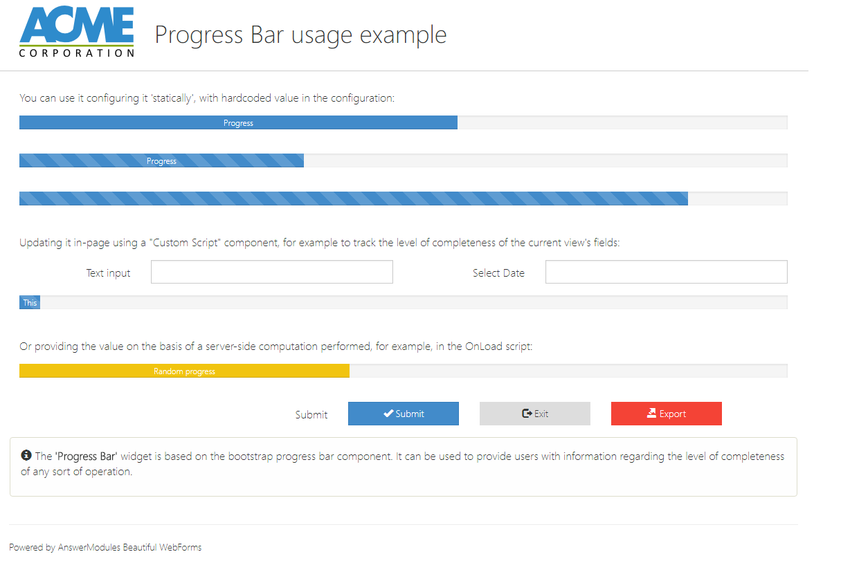 A widget based on the bootstrap progress bar component. It can be used to provide users with information regarding the level of completeness of any sort of operation