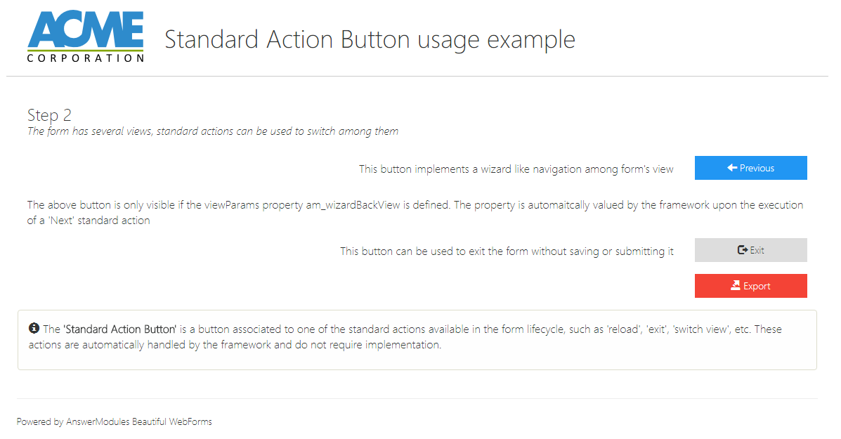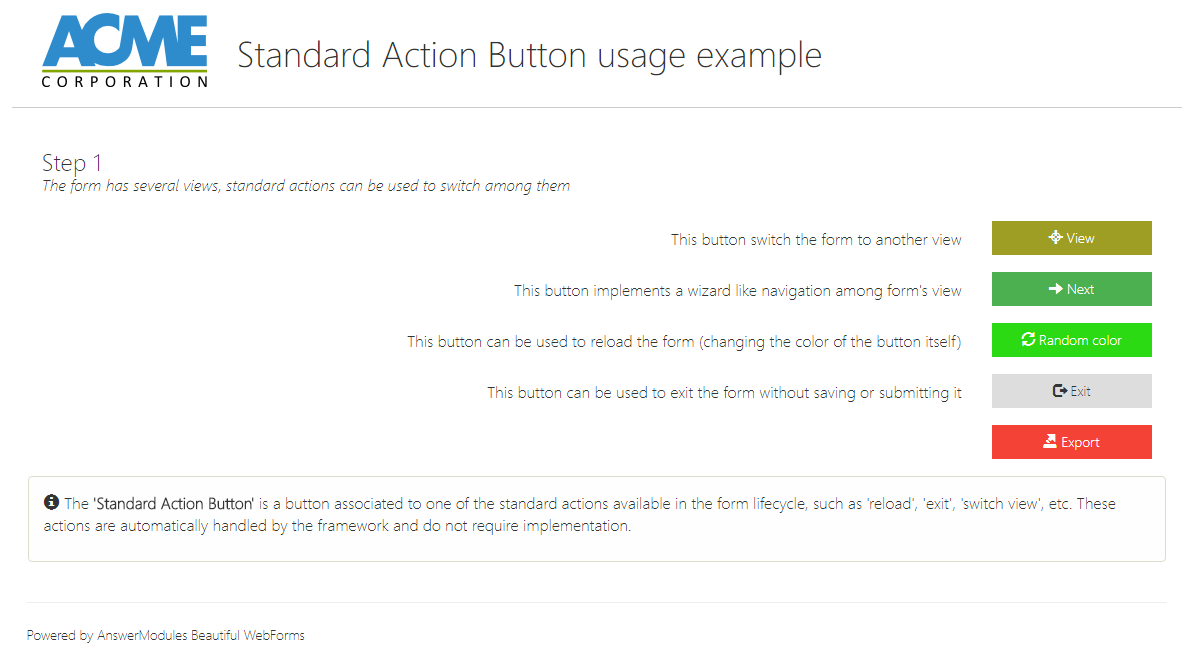 A button associated to one of the standard actions available in the form lifecycle, such as 'reload', 'exit', 'switch view', etc. These actions are automatically handled by the framework and do not require implementation.