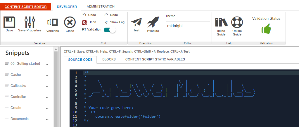 Upon creation, the object can be edited with the web-based IDE selecting the 'Editor' function in the object function menu. The function is also available as a promoted function.