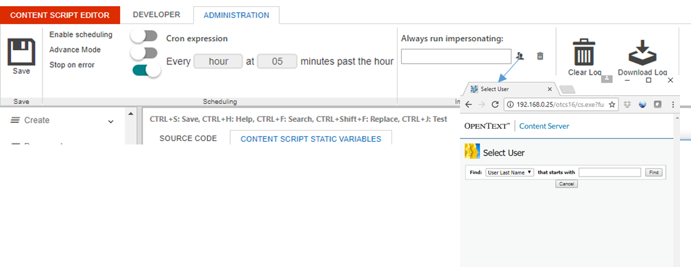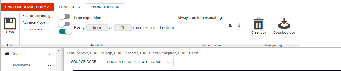 The Content Script scheduling utility is available from within the Specific > Advanced Settings tab or from the Content Script Editor in the Administration tab (if visible). The utility allows to schedule the automatic execution of Content Scripts (that is, without the need for a user to trigger the execution explicitly).