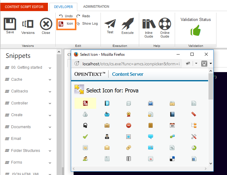 The desired icon can be selected by clicking on the icon button on the Content Script's Developer tab and selecting a specific icon within a set of available icons.