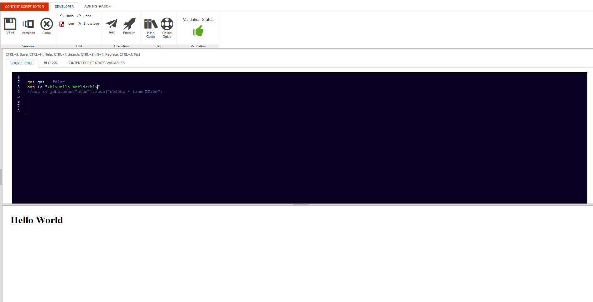 As said, scripts are persisted as "documents" on Content Server. Whenever you execute a script a component named Script Manager retrieves the script's last version and, either compiles it (and caches the compiled version) or loads a pre-compiled version of it for execution. Scripts' execution is managed by another component named Content Script Engine. The Content Script Engine executes the script's code against the provided execution context (the execution context is the "container" through which the script's code can access the Content Script's services, environment variables, support variables, database, etc..). The internals of both the Script Manager and the Script Engine are not relevant for the purpose of this manual and won't be discussed.